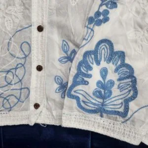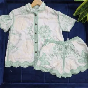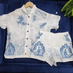 Elegant white cotton co-ord set designed for comfort and style, featuring a short-sleeve button-up shirt with intricate cutwork and delicate embroidery. The matching shorts showcase coordinating embroidered motifs and a relaxed elastic waist for an easy fit. Perfect for casual outings, resort wear, or summer strolls